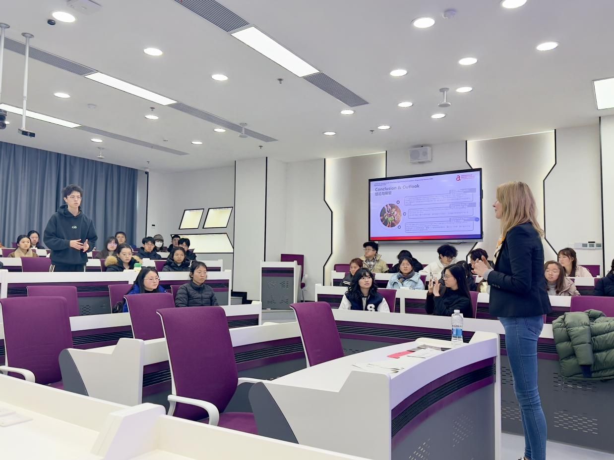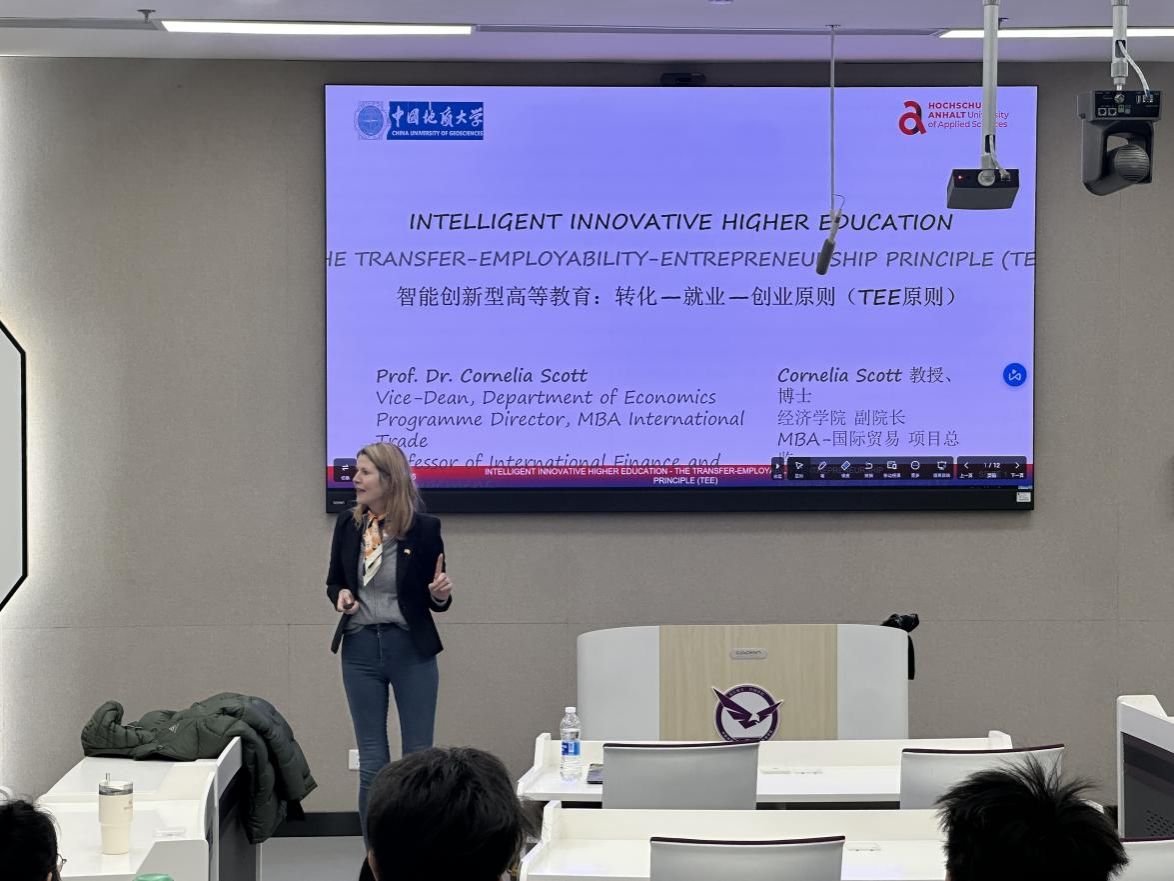 3月5日下午,Scott教授在崇信楼108教室面向学院师生进行了以“智能创新型高等教育:转化—就业—创业原则(TEE原则)”为主题的专题讲座。本次活动吸引了来自金融、会计、工商管理等专业的本科生和研究生,其中很多是未来有意赴德留学或对跨文化教育感兴趣的同学。Scott教授曾是德国最年轻的管理学教授之一,兼具跨国教育背景与“四大”等丰富业界高管经验,长期深耕青年创业辅导及高等教育学术质量评审,具有丰富的国际化人才就业与创业能力培养实践经验。她围绕德国区域管理的现状与挑战展开了深入浅出的讲解,重点介绍了德国在校企合作推进下,学生就业与创业能力培养方面的成功实践,通过具体案例展示了学校与企业如何协同设计课程、提供实习机会以及搭建孵化平台,详细介绍了如何有效提升学生的实践技能与创新思维。讲座中,我院学生积极提问,与Scott教授交流互动,讲座达到积极效果。