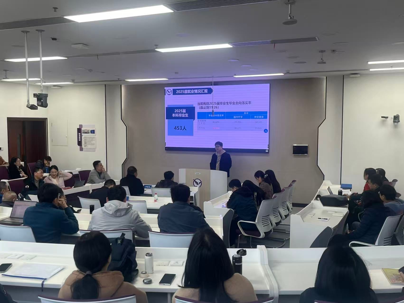 会上,学院辅导员分别就本科生各班级学风、就业情况,班主任年度考核和评优工作等进行了汇报介绍。分团委书记、2023级辅导员徐媛结合近期课堂考勤监督强化、请假流程进一步规范、晚自习日常管理和学业帮扶计划等方面介绍了学院“红鹰促学”计划开展情况和阶段性成果。她从学生课程成绩的具体数据客观分析了当前学风建设中的亮点与存在的不足,提醒班主任们关注班级学风动态。2022级辅导员蔡杨就毕业生班级就业工作展开汇报。他结合具体数据分析了近年来毕业生就业去向,学生考公、考研意向的变化新形势,针对2025届毕业生和2026届毕业年级的学生就业意向,就业行业分布特点,以及学院就业帮扶成效和面临的工作挑战作了详细介绍,并围绕下一步就业指导工作为班主任开展就业帮扶提供了一定的方向参考。学工办主任努尔夏提・居勒提介绍了年度班主任工作考核及评优工作,并就相关要求进行解读。他从考核原则、评优指标、标准流程、激励机制等方面逐一说明,动员班主任们积极参加考核和评优,以评促优充分展现班级风貌和培养学生的成效。