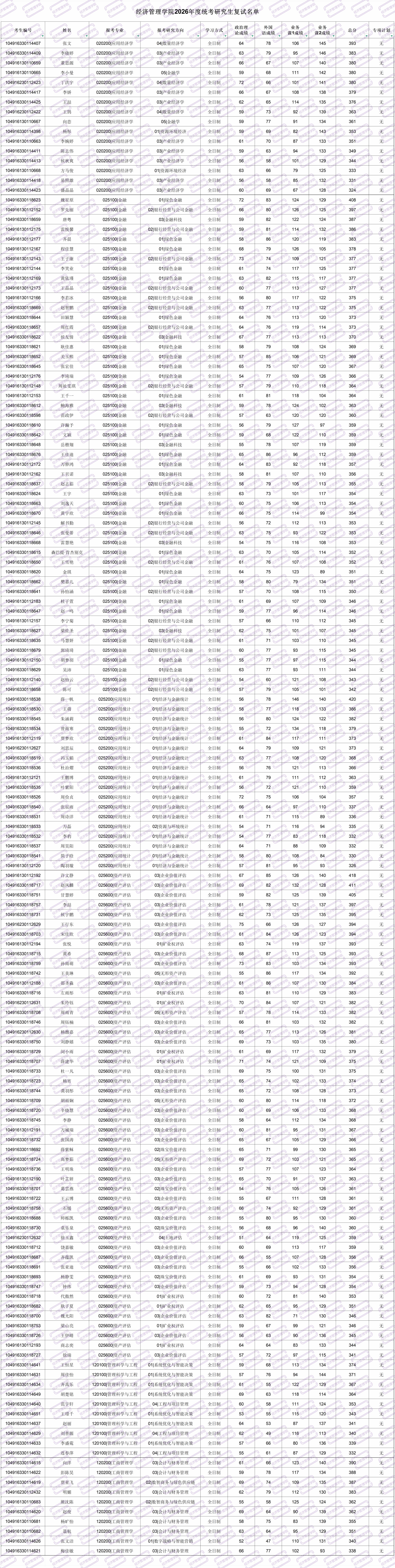 说明:少数民族骨干计划、退役大学生士兵计划和单独考试的复试分数线及复试名单请关注学校研究生招生信息网通知公告。